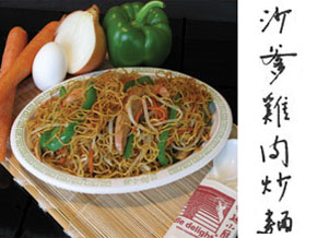 egg noodles stir-fried with slices of chicken, strings of carrots, bean