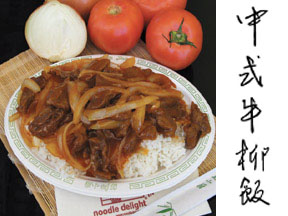 Tender pieces of beef accompanied by tomatoes and onions cooked with sweet and sour sauce served over a bed of rice.