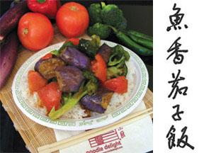 Pieces of deep-fried eggplants are complimented with tomatoes, broccoli and julienned onions simmered with a spicy sauce served over a bed of rice.
