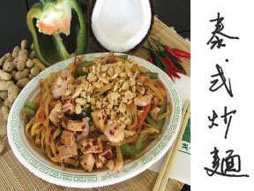 Thai Noodle Delight's take on a Thai Classic! Our Pad Thai features a host of shrimp and tender chicken slices with a bountiful mix of green peppers, carrots and beansprouts sauteed in our own spicy Thai sauce. We then garnish the dish with crushed peanuts to give it that extra crunch! |