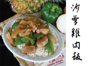Generous chunks of chicken mixed with pineapples, julienned green peppers and onions simmered with satay sauce with a touch of spice.
