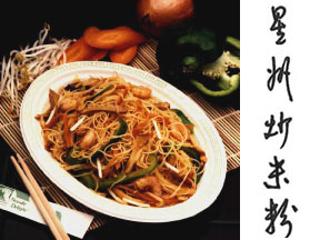 Singapore From the famous open-air bazaars, this dish is everyone's spicy favourite. It is made from thin rice noodles mixed with a melange of fresh shrimp, diced BBQ pork, shredded egg, green peppers and onions. The City : Singapore is located just to the south of Malaysia. It is officially known as the Republic of Singapore with 59 islands that cover an area of 641 sq. km (smaller than New York City). Singapore is a thriving city of 2.9 million made up of Chinese (majority), Malay, Indian and other people from around the world. This mix of delicate Chinese and spicy Indian with the know-how of the Malay and the sophistication of Europe, gives the food here an unmistakable flavour. Click here for more information about Singapore |
